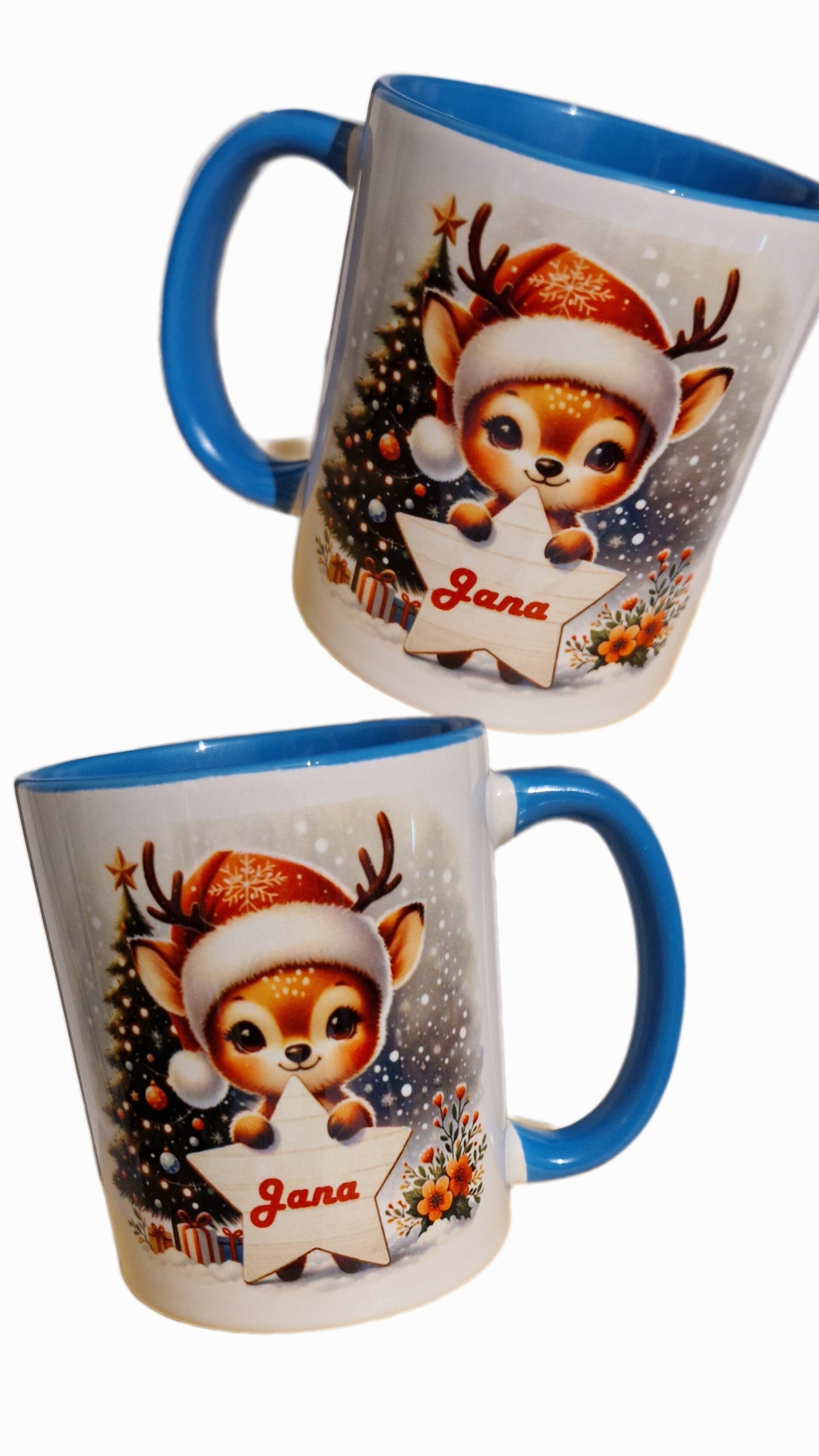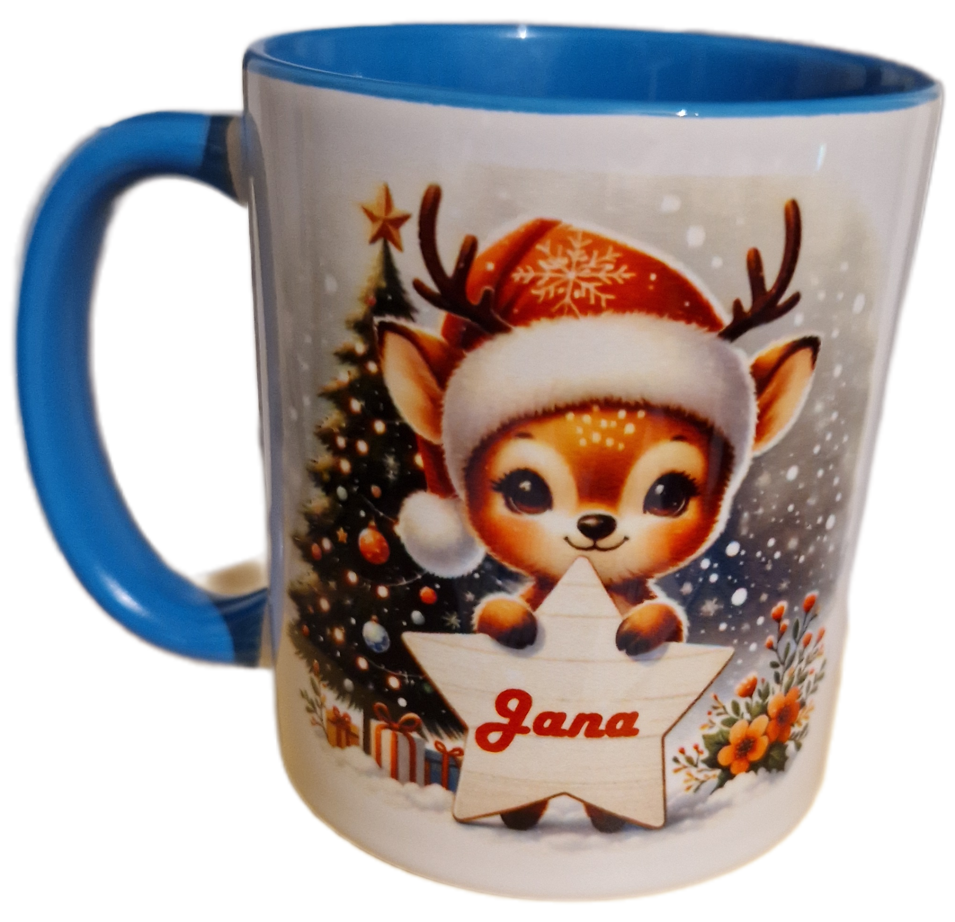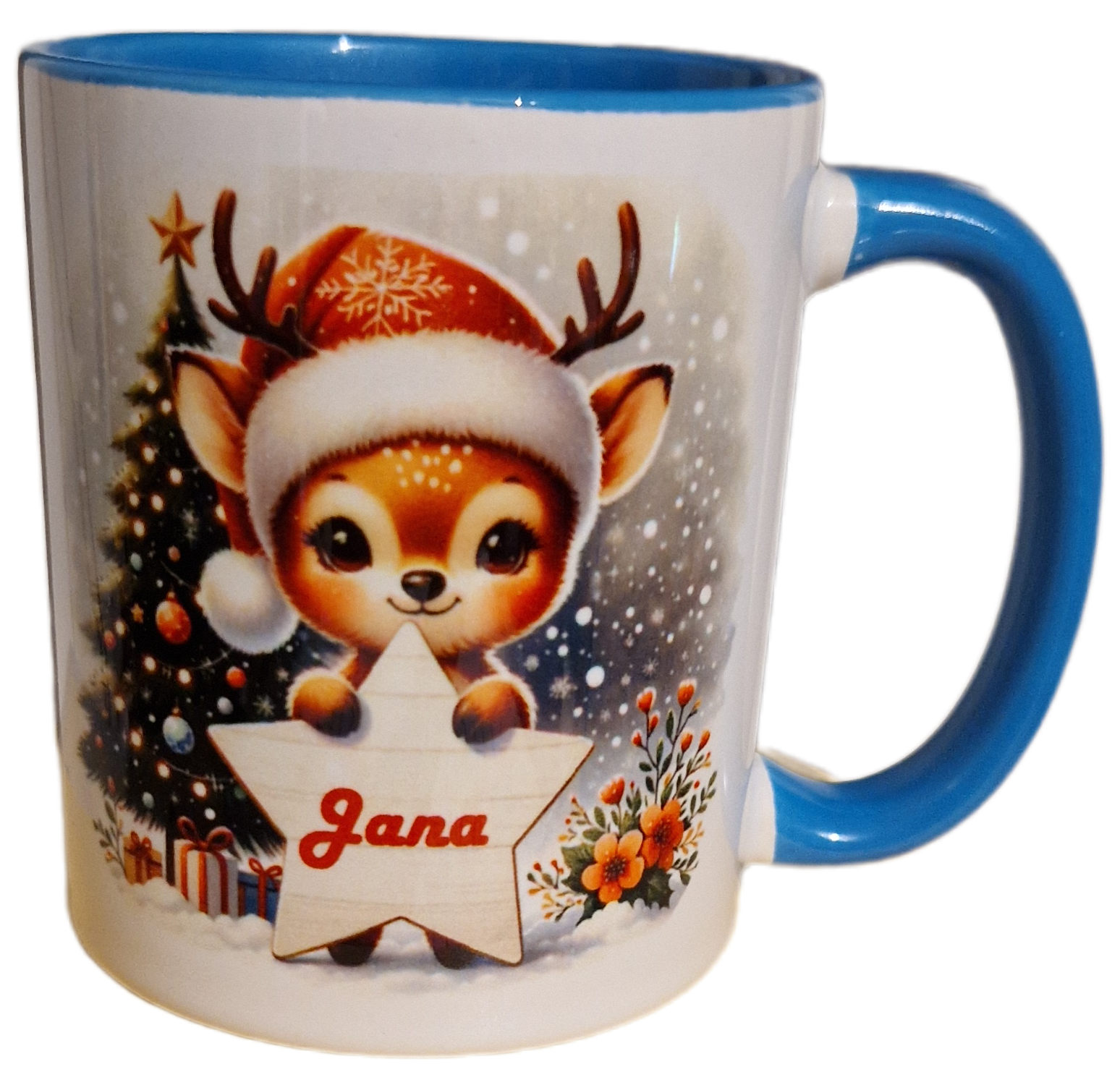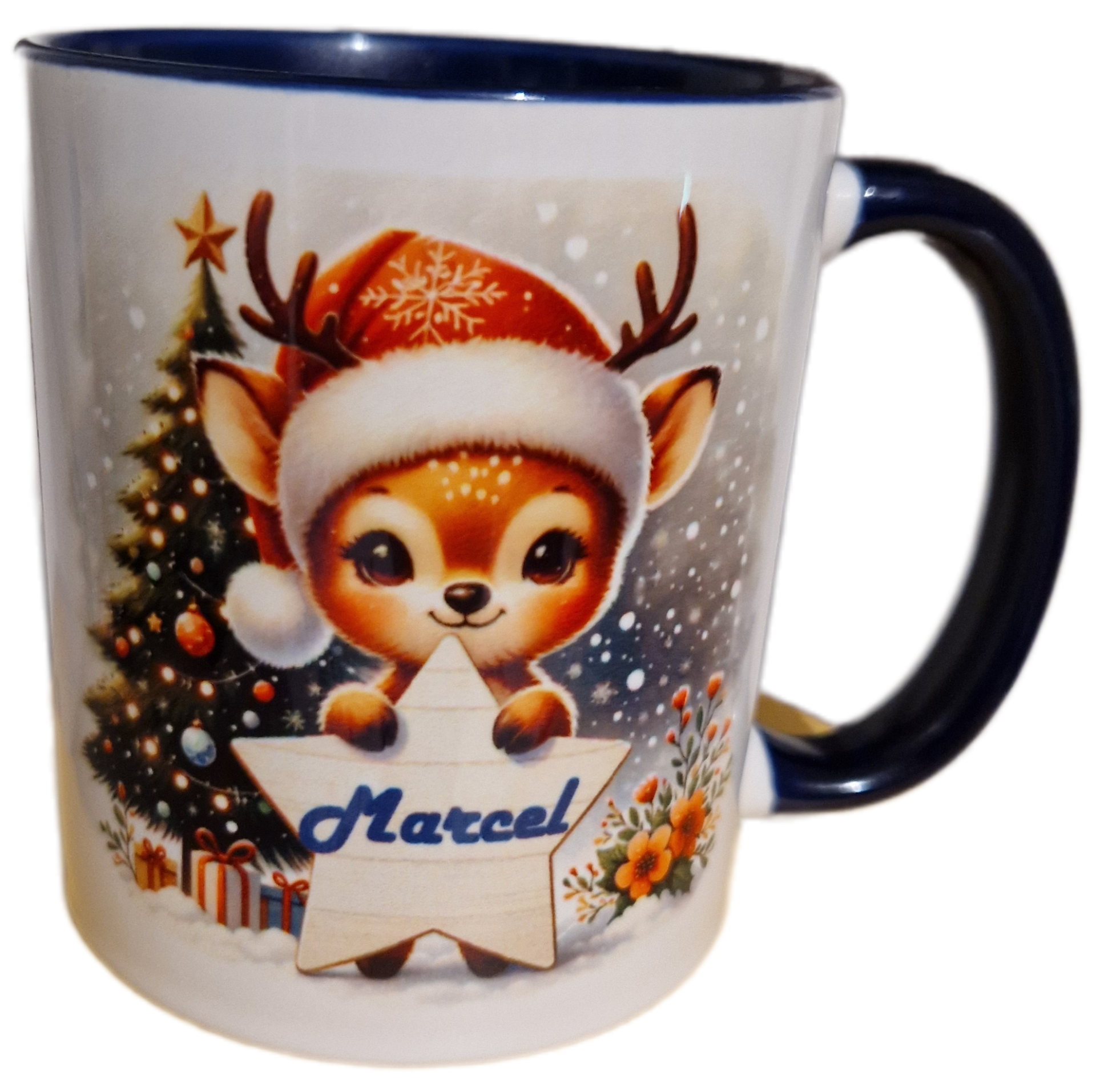 Weihnachtstasse Rentier mit Mütze, personalisierbar
