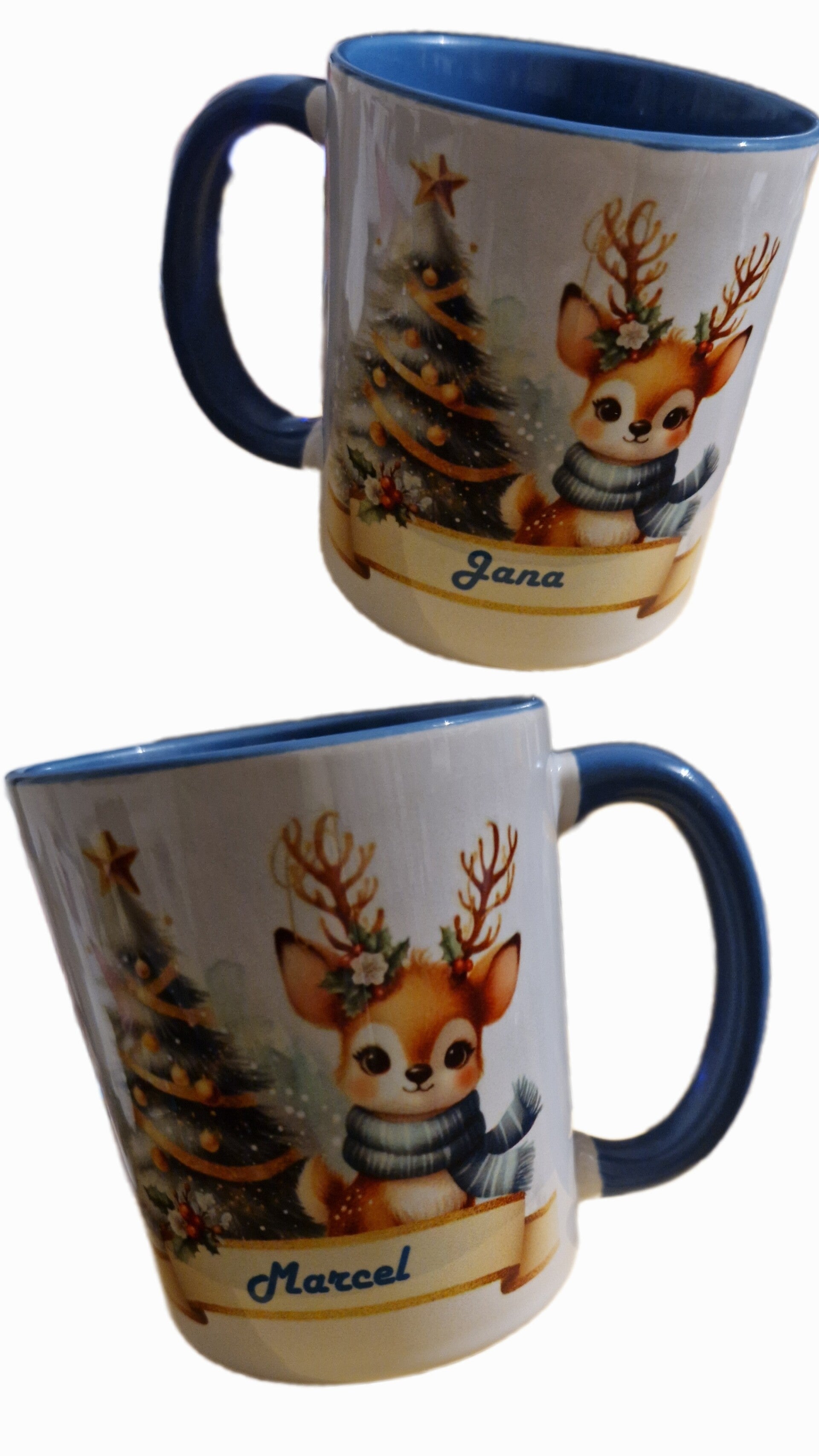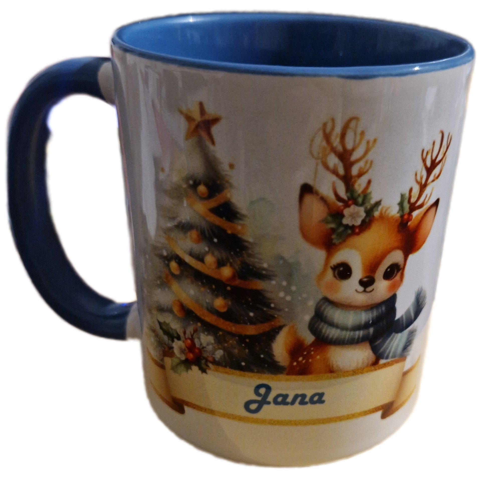 Weihnachtstasse Rentier mit Schal; personalisierbar